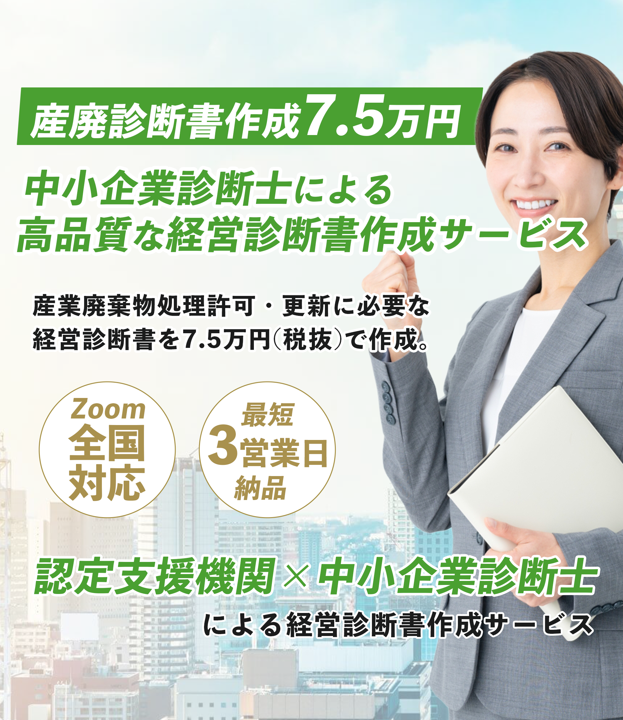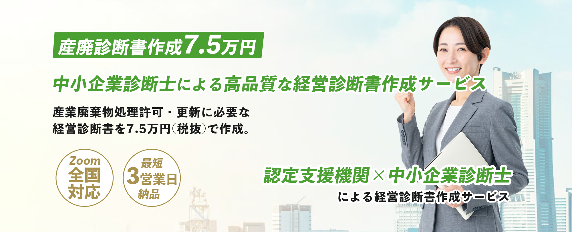 産業廃棄物処理業や収集運搬業の許可申請・更新で求められる経営診断書を、中小企業診断士がオンラインで丁寧に作成します。事業内容のヒアリングから診断書の作成まで分かりやすくサポートし、最短3営業日での迅速な対応が可能です。